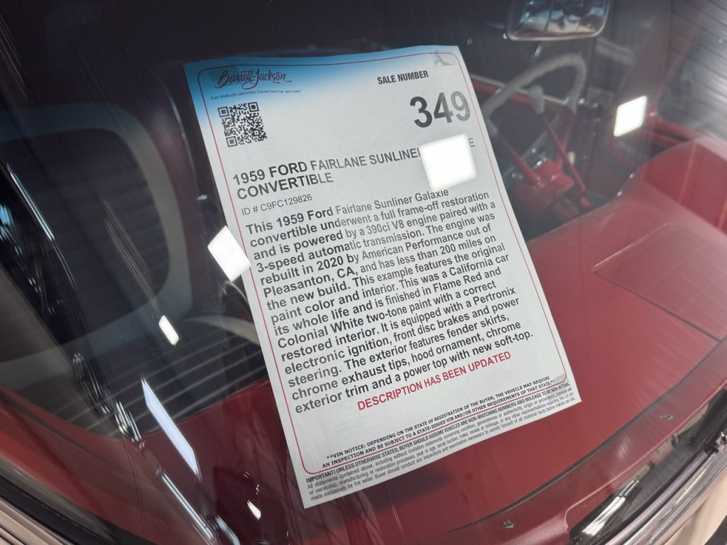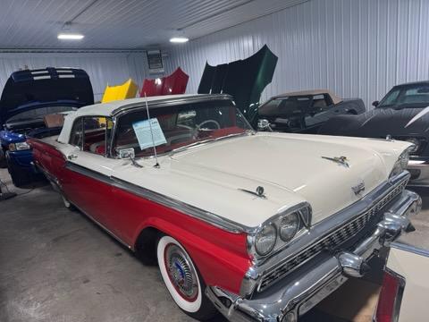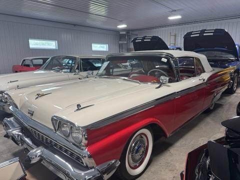 Stock number: C1959, VIN: C9FC129826, Fully Restored Fairlane Sunliner Galazie Convertible, Colonial White and Red Exterior, 390ci V8, 3 speed Automatic Transmission, Full frame-off restoration. Engine rebuilt in 2020, Odometer reads 30,944